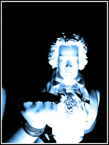 a bust of beethoven, brass knuckles, blue.